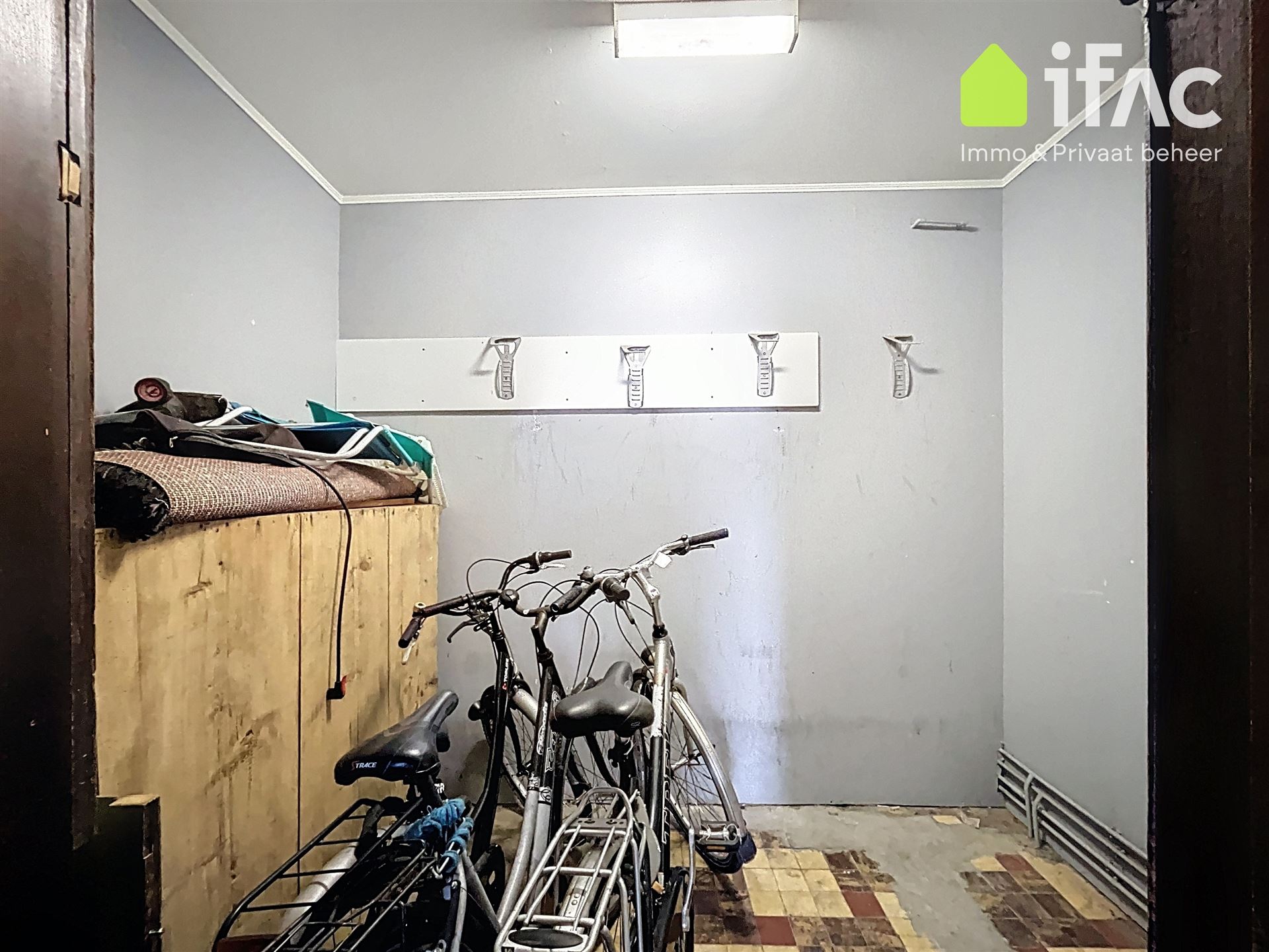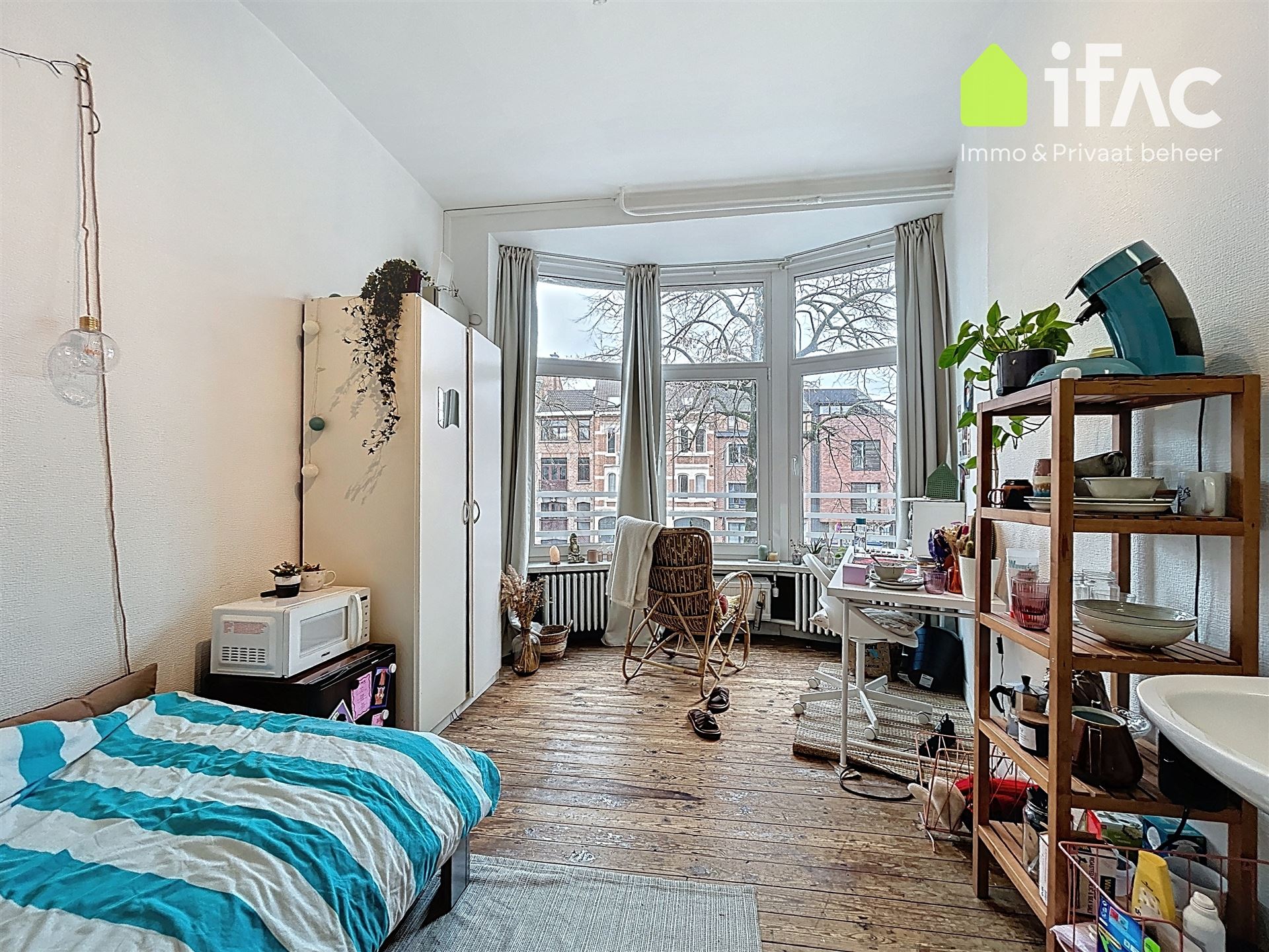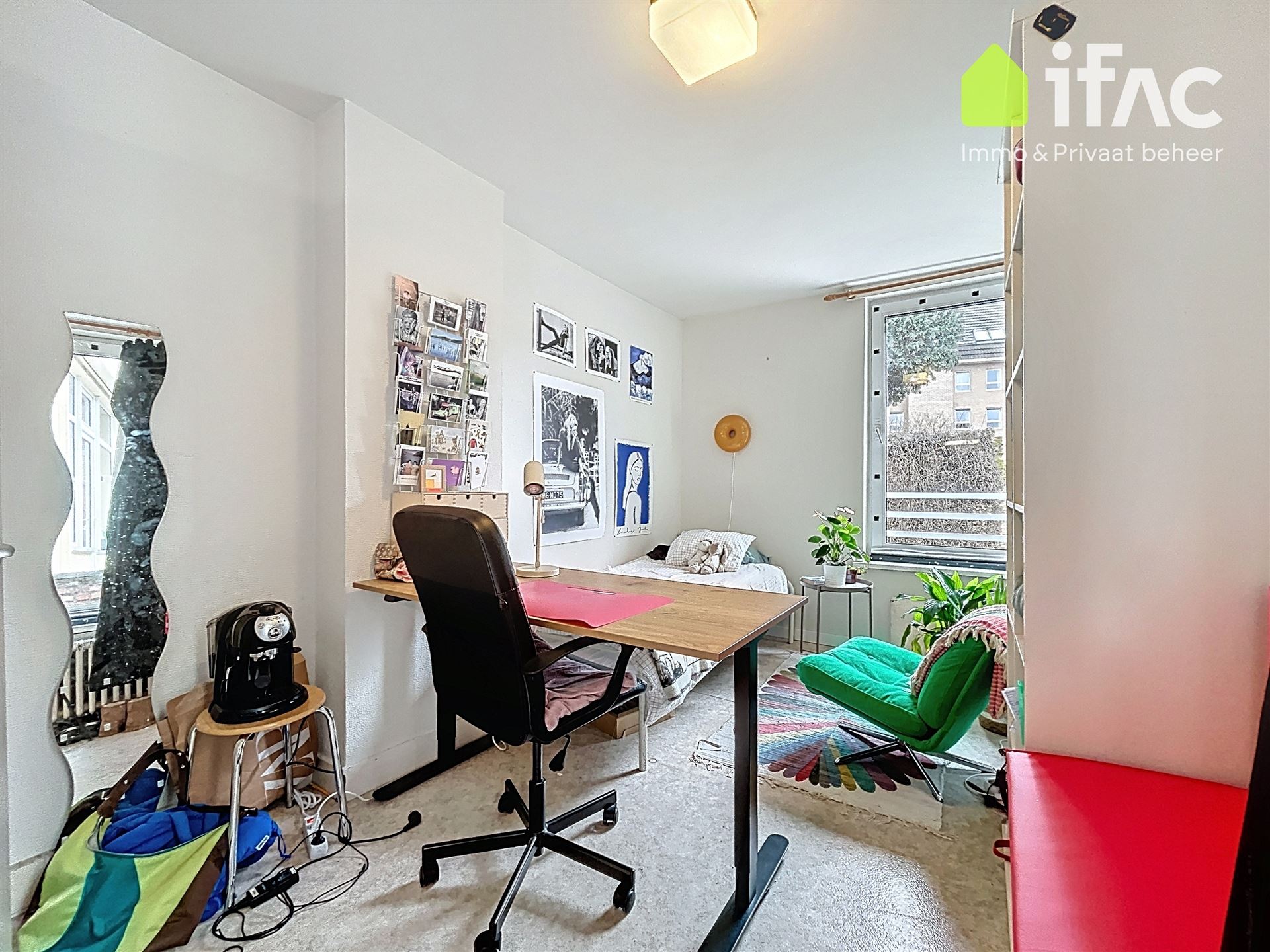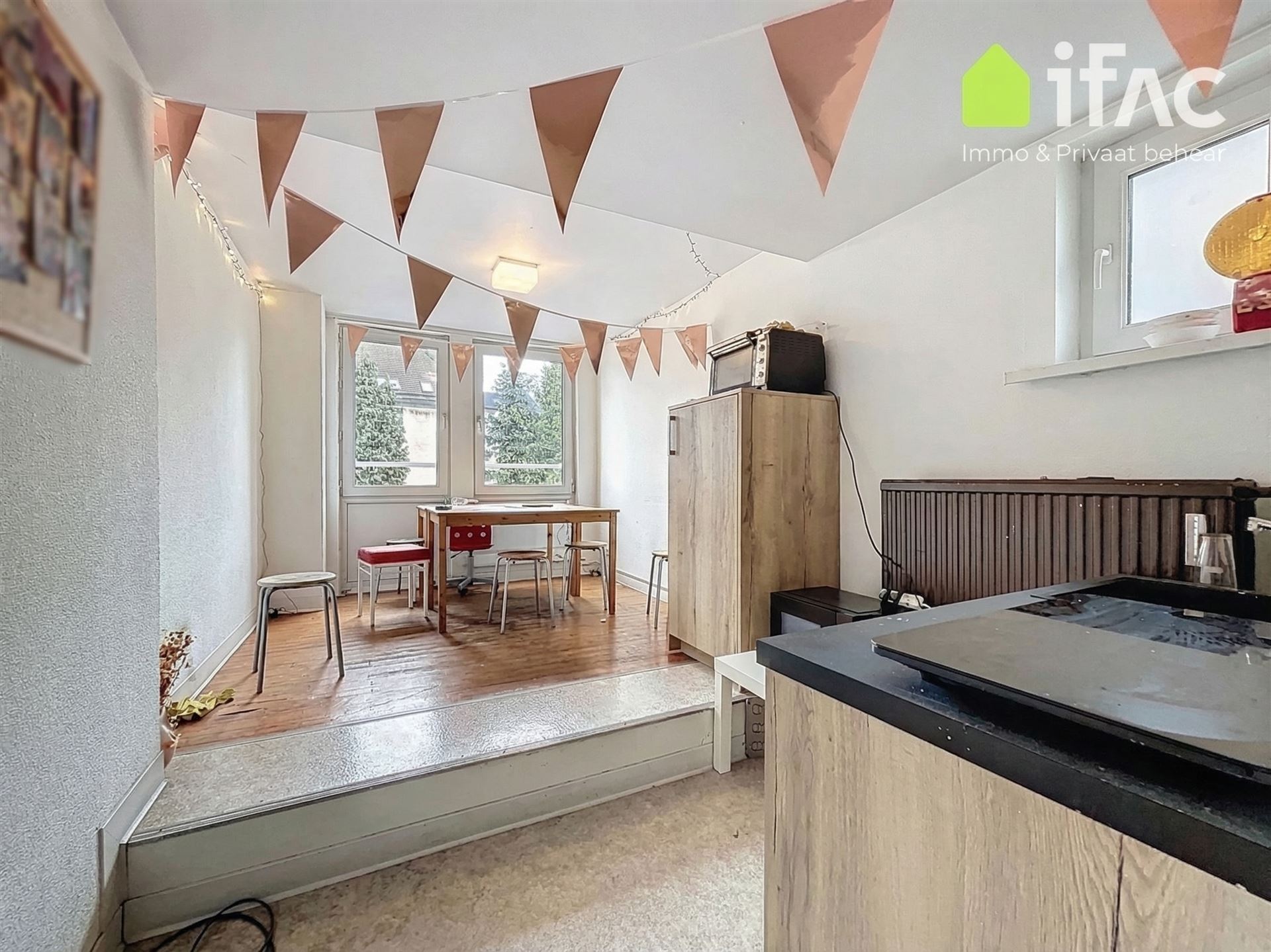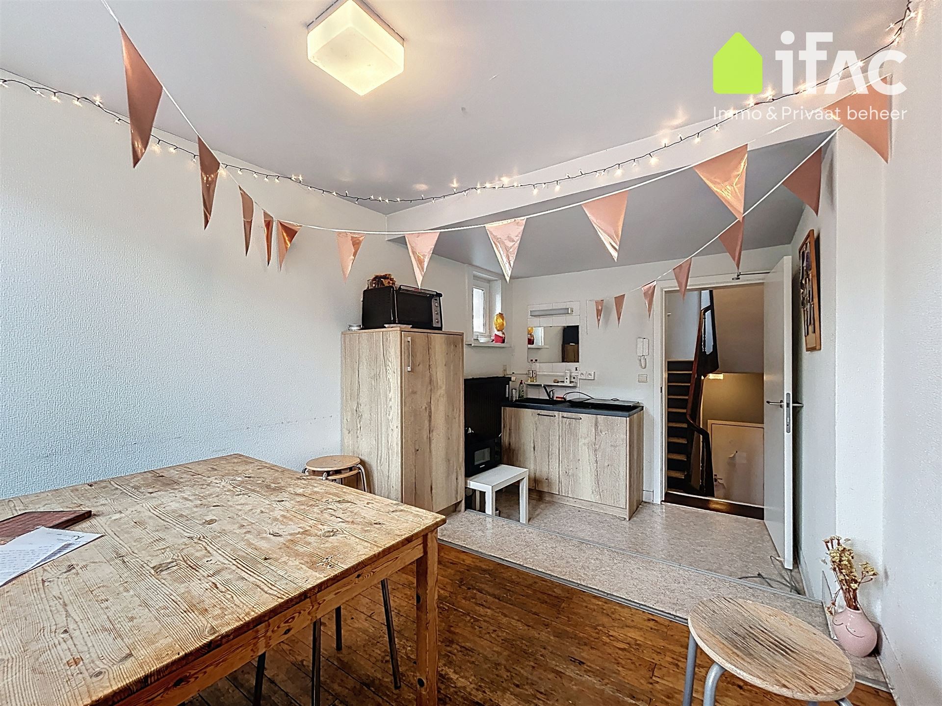 Second floor: spacious common sitting room with cooking facilities (+/- 13m²), 2 studios of +/-14,7m² and 16m², shower room (+/- 2m²), separate toilet.
