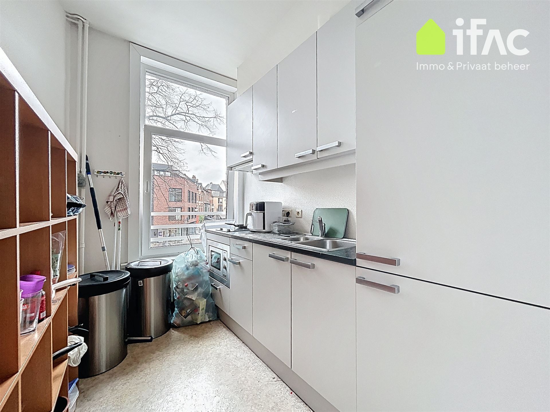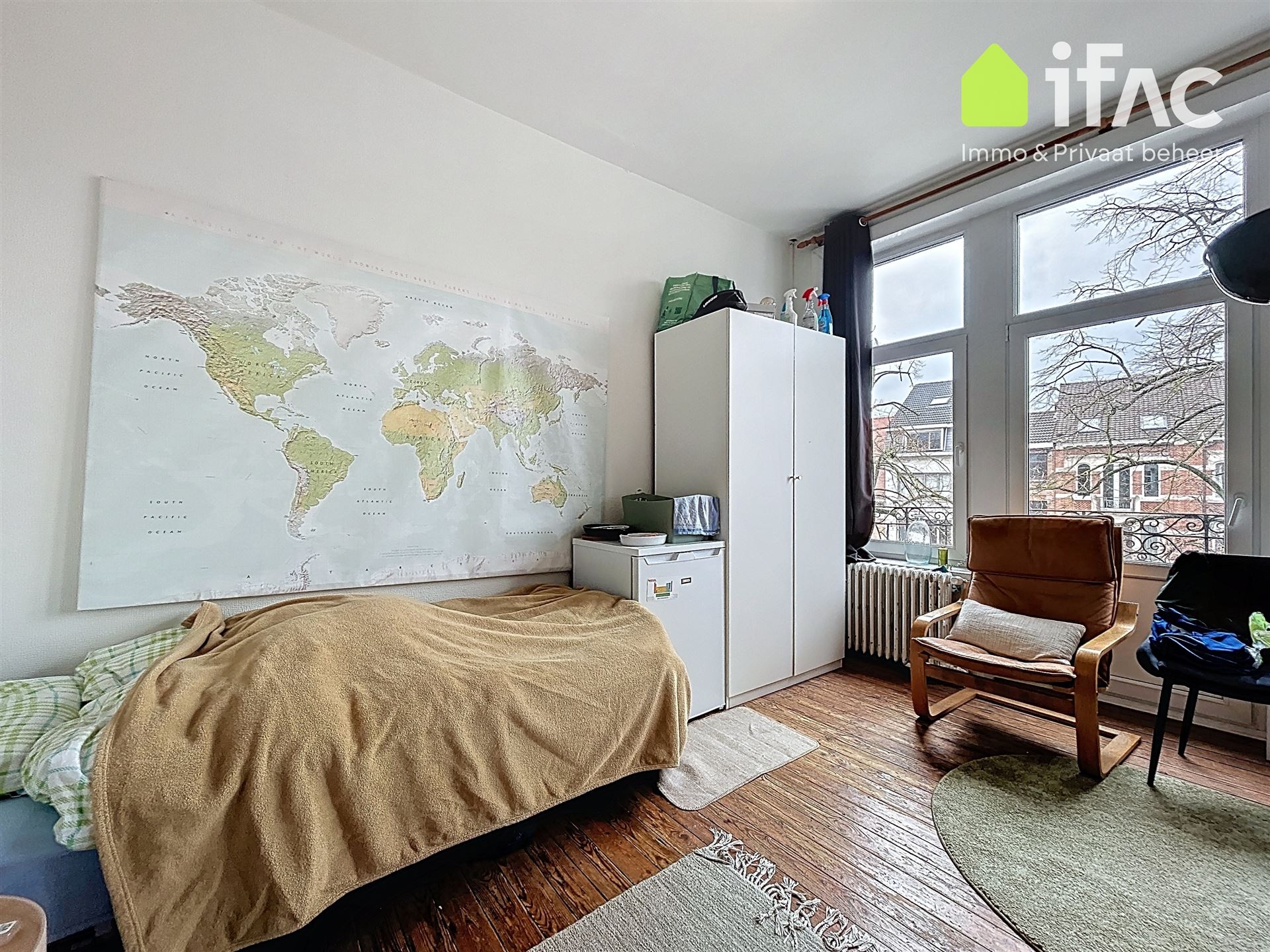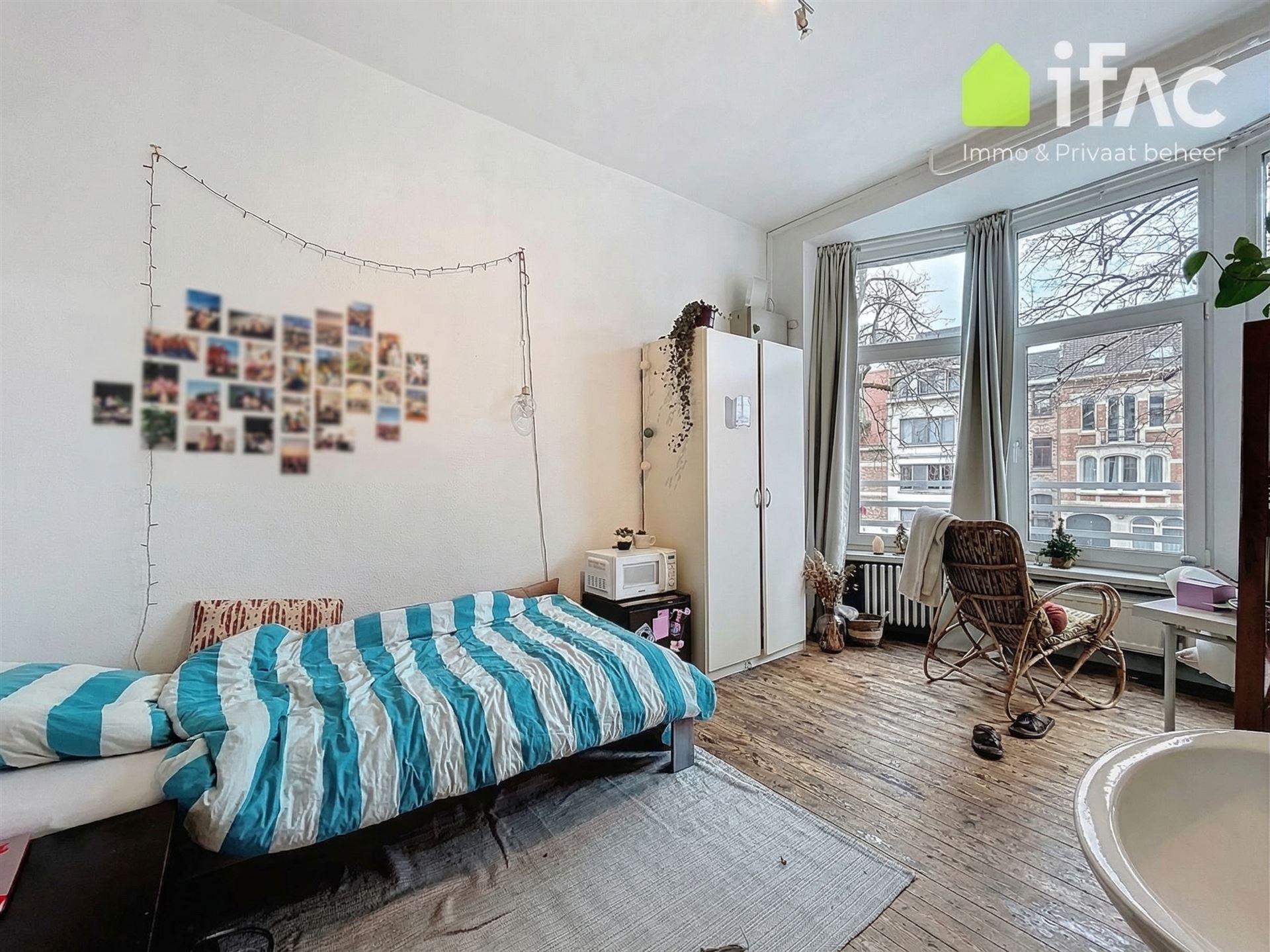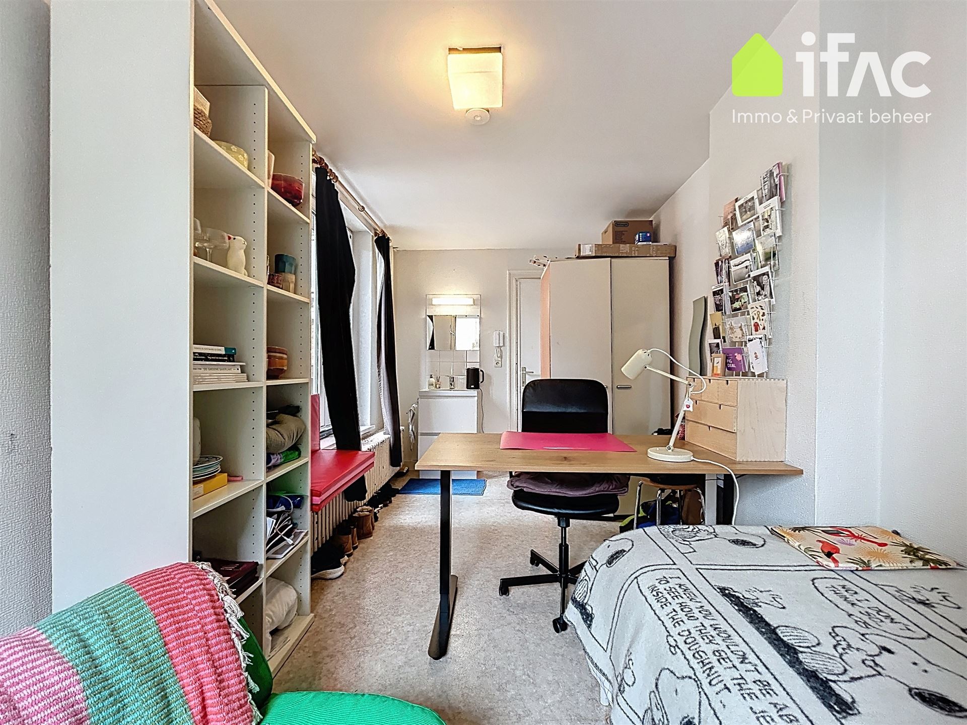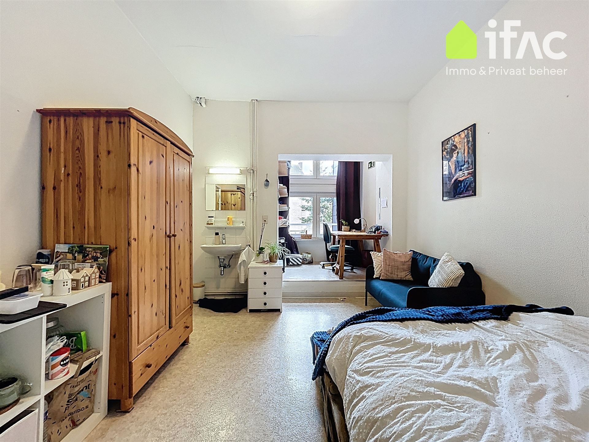Second floor: spacious common sitting room with cooking facilities (+/- 13m²), 2 studios of +/-14,7m² and 16m², shower room (+/- 2m²), separate toilet.