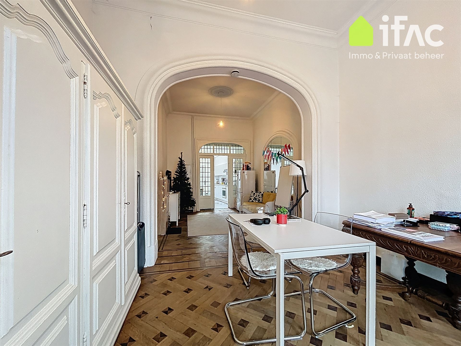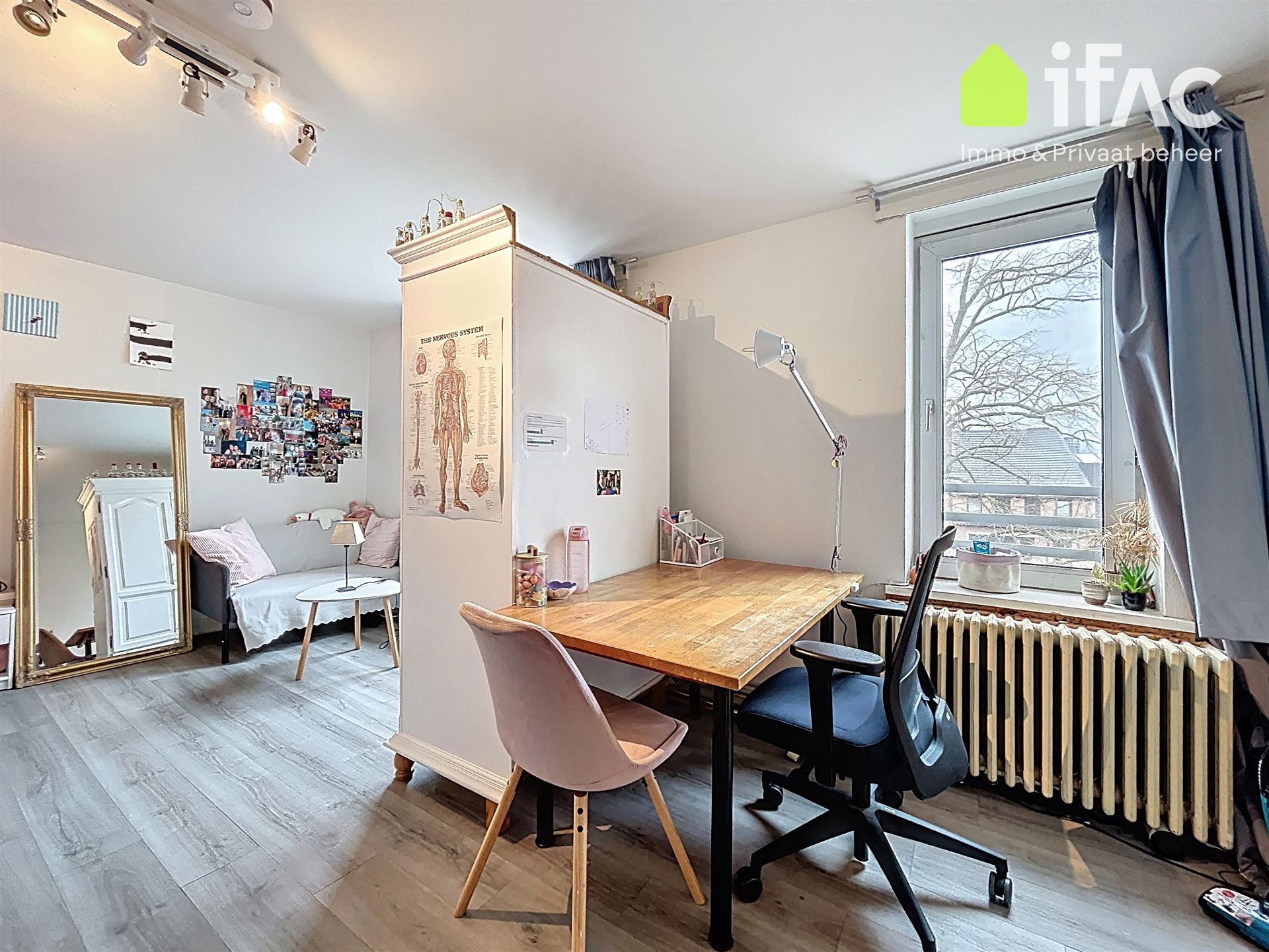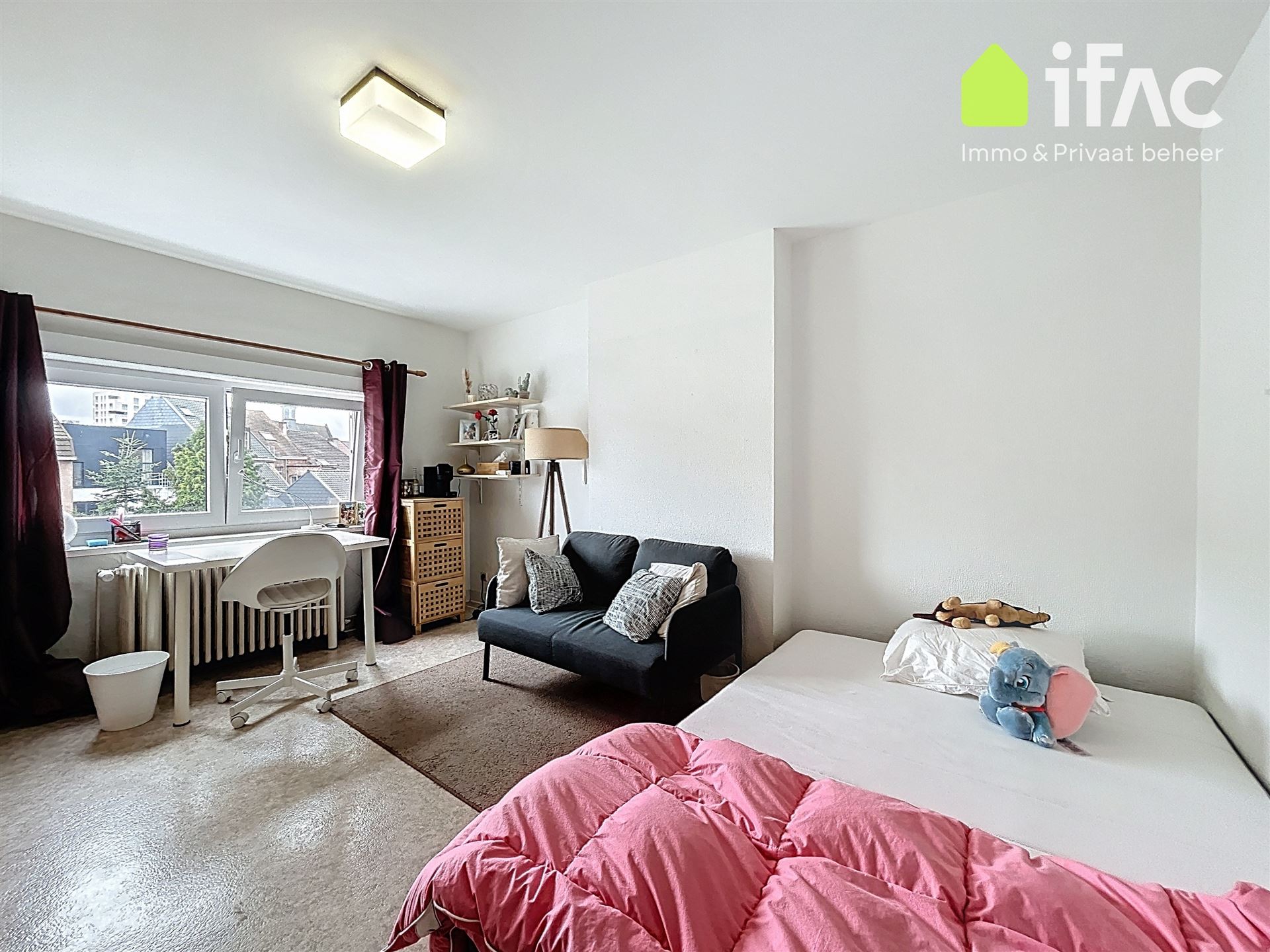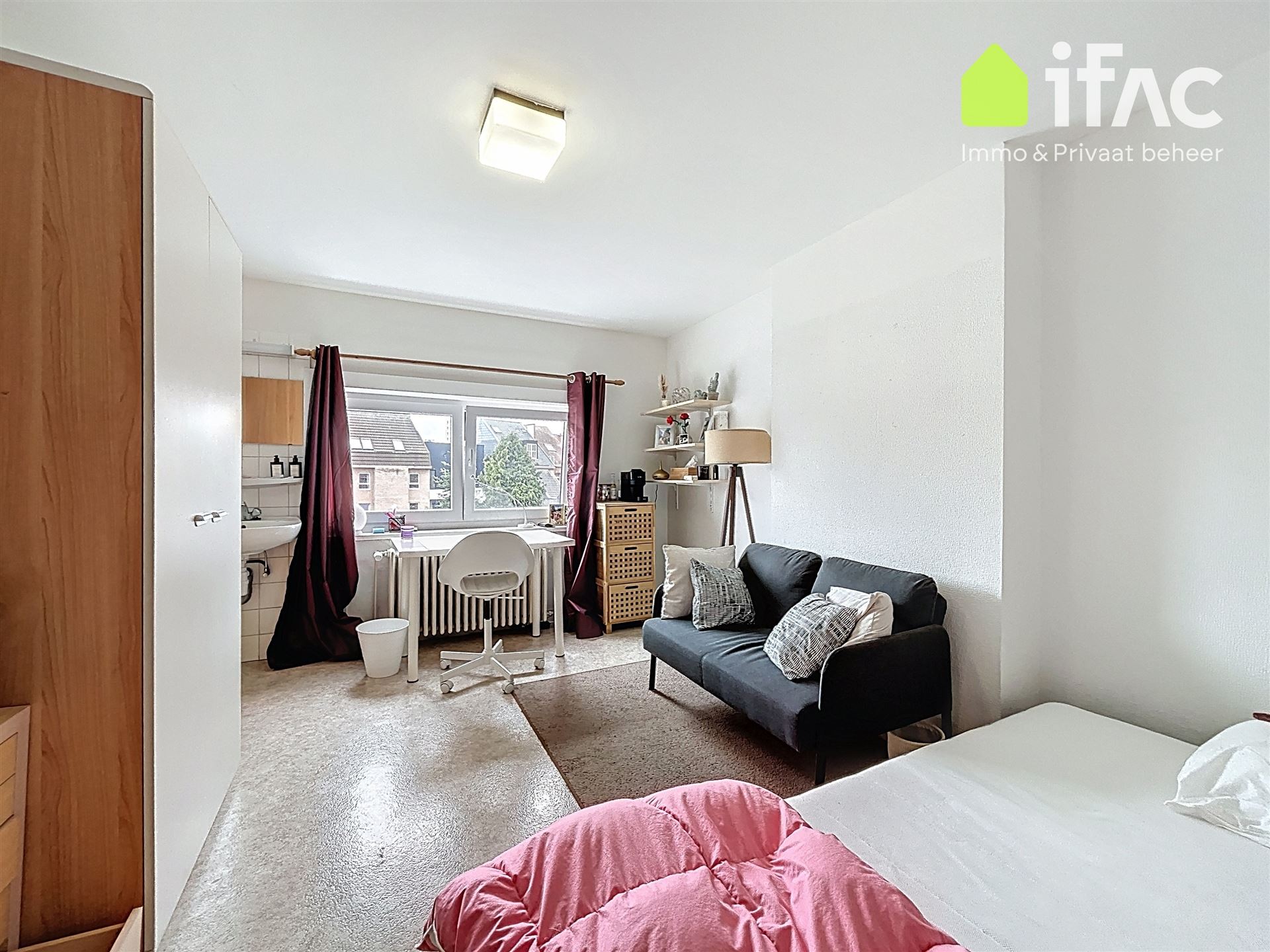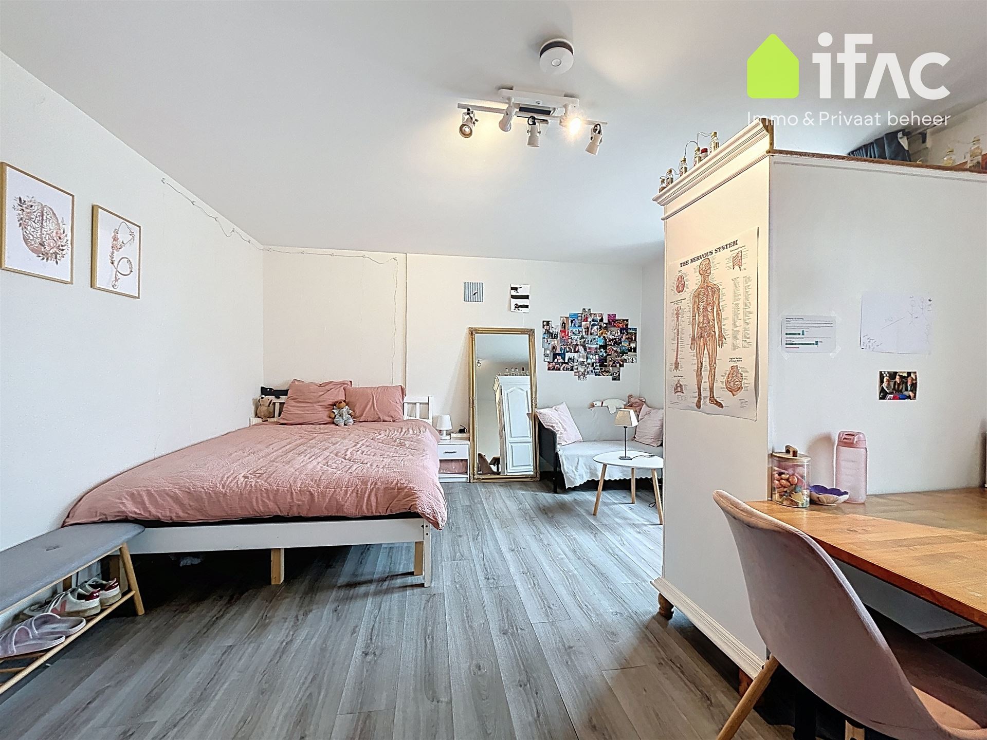 Second floor: spacious common sitting room with cooking facilities (+/- 13m²), 2 studios of +/-14,7m² and 16m², shower room (+/- 2m²), separate toilet.