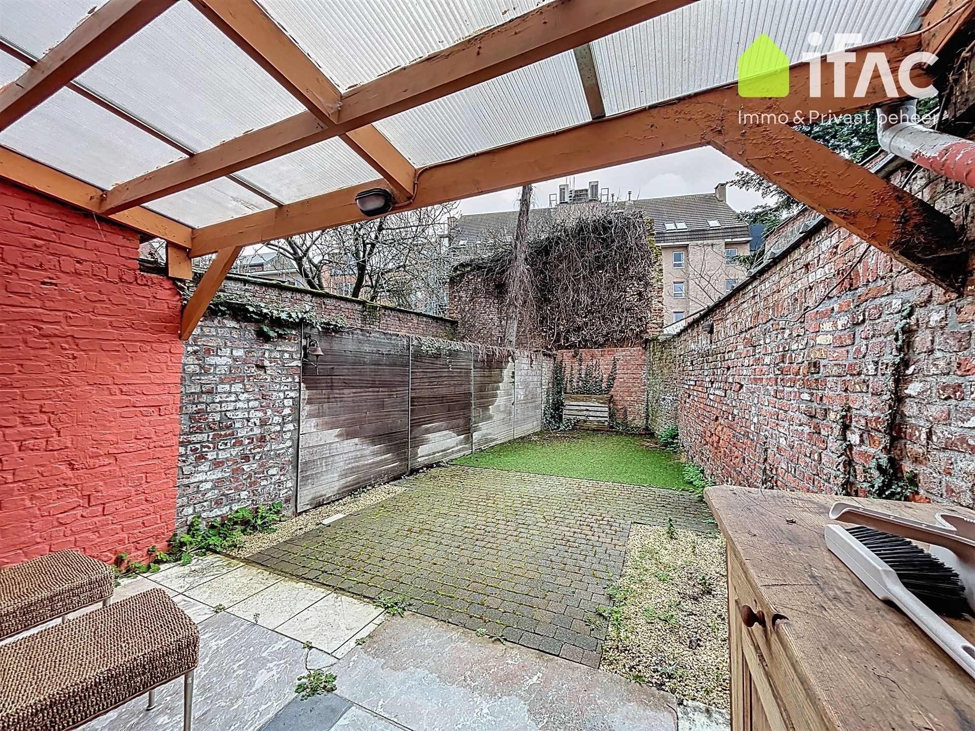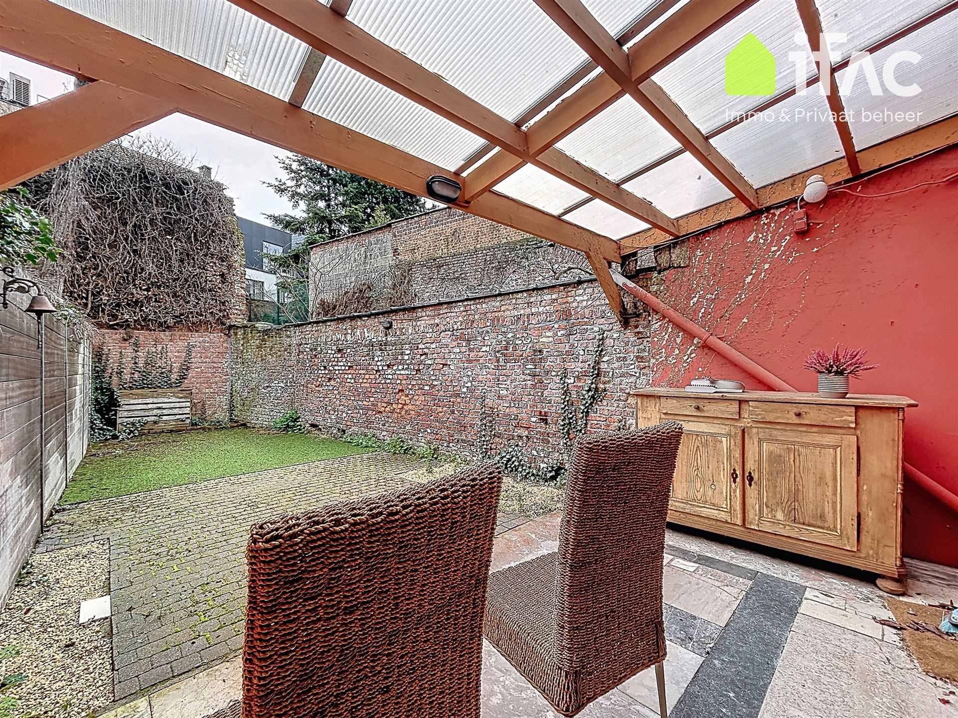 Ground floor: apartment with 1 bedroom (+/- 11m²) with ensuite bathroom (+/- 6m²) (shower, toilet, sink in furniture), equipped kitchen (+/- 9m²) spacious living room (+/- 30m²) and with private terrace and garden.