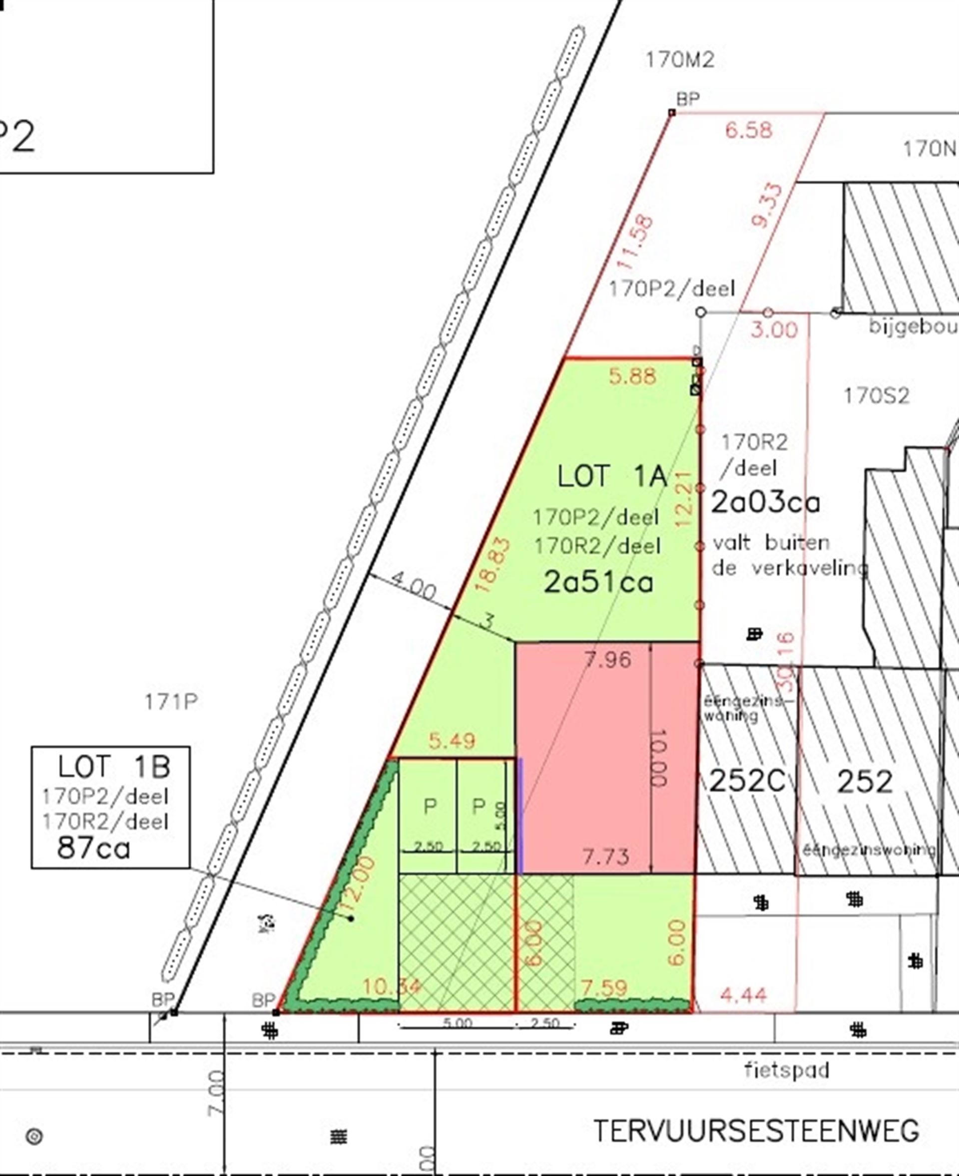 Straatbreedte van +/- 17,93m, niet vervallen verkaveling, zie bouwvoorschriften (volgens ABL) in bijlage. Er dienen 2 parkings gecreëerd te worden waarbij de woningen met nummer 252 en 252C via een erfdienstbaarheid hiervan gebruik kunnen maken.